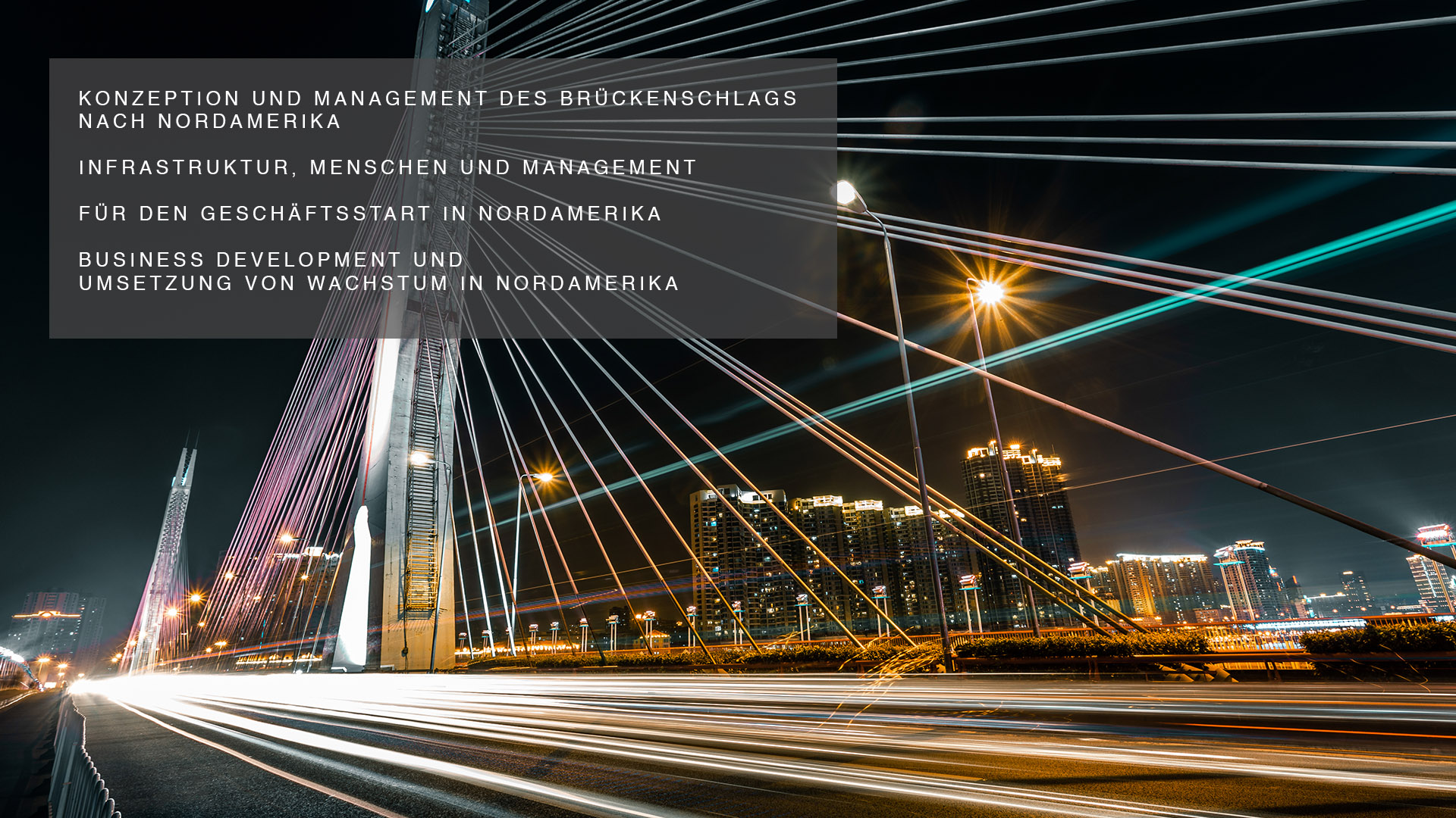 Bridging North America ist eine Gesellschaft für Interim Management und Executive Assistance, die sich als führender Partner für umsetzungsorientierten Marktauf- und -Ausbau in Nordamerika versteht und die Stärken und Kultur deutscher bzw. europäischer Unternehmen mit den Stärken und der Kultur des nordamerikanischen Marktes vereinigt.